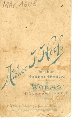 Auf dem Foto sieht man ein junges Mädchen in einem dunklen Oberteil mit Puffärmeln und einem Stehkragen. Der Halsbereich und der mittlere Brustbereich sind gemustert und durch eine Rüschenbordüre abgesetzt. Am Kragen trägt es eine Brosche. Die Haare werden am Hinterkopf zusammengehalten. Die Aufnahme entstand im Atelier F. Hertz in Worms, Inhaber: Robert Franck, Gymnasiumstr. 4. Auf der Rückseite befindet sich Eigenwerbung und der Hinweis auf Nachbestellungen und Vergrößerungen.