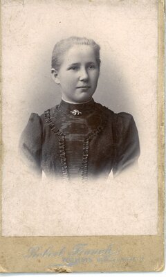 Auf dem Foto sieht man ein junges Mädchen in einem dunklen Oberteil mit Puffärmeln und einem Stehkragen. Der Halsbereich und der mittlere Brustbereich sind gemustert und durch eine Rüschenbordüre abgesetzt. Am Kragen trägt es eine Brosche. Die Haare werden am Hinterkopf zusammengehalten. Die Aufnahme entstand im Atelier F. Hertz in Worms, Inhaber: Robert Franck, Gymnasiumstr. 4. Auf der Rückseite befindet sich Eigenwerbung und der Hinweis auf Nachbestellungen und Vergrößerungen.