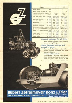 4seitige, englischsprachige Broschüre, die gefaltet eine DIN A4 Größe besitzt. Die Broschüre beinhaltet Diesel-Walzen der Gewichtsklasse 4 bis 10 Tonnen. Auf der Vorderseite des farbigen Prospekts befindet sich u.a. die perspektivische Skizze einer Straßenwalze. Die beiden Innenseiten beinhalten Zeichnungen und nähere Beschreibungen der dargestellten Bauteile. Außerdem sind Zeichnungen abgebildet, die den Typ L (5 Tonnen) und den Typ M (bis 10 Tonnen) in einer Seitenansicht als Ganzes zeigen. Technische Angaben zu den angebotenen Modellen der Baumaschinen sowie eine tabellarische Darstellung der jeweiligen Leistungsmerkmale und der Maße sind auf der Rückseite zu finden. Außerdem gibt es dort eine Aufzählung der übrigen Produktpalette der Firma Zettelmeyer. Die Broschüre wurde von dem in Trier ansässigen Industriegrafiker Erich Prinz erstellt und in der Druckerei Dackweiler & Co. in Trier gedruckt. Ein vergleichbares Exemplar in deutscher Sprache befindet sich ebenfalls im Besitz des Freilichtmuseums.