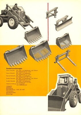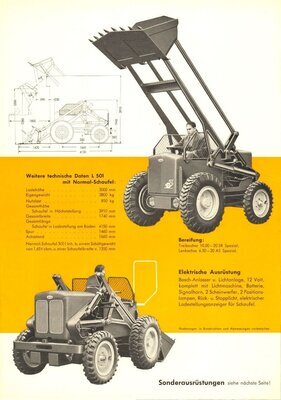 8seitige Werbebroschüre für den neuen Hublader Typ L 501. Die Broschüre wurde mutmaßlich 1957 erstellt. Auf der Vorderseite des farbig in der Größe DIN A 4 gestalteten Heftes ist ein Hublader mit angehobener Schaufel zeichnerisch abgebildet. Die Innenseiten 2 bis 6 enthalten neben detaillierten Zeichnungen und Schnittbildern verschiedener Bauteile dieser Maschine, Beschreibung der jeweiligen Konstruktion und der Leistungsmerkmale. Außerdem wird daneben das Zubehör der als temperamentvolles Universalgerät bezeichneten Maschine sowie die angebotene Sonderausrüstung beschrieben. Die Seite 7 ist im wesentlichen mit Schwarz-Weiß-Bildern und Ablichtungen gestaltet, die den zugelassenen und von der Steuerpflicht befreiten Schaufellader bei unterschiedlichen Arbeitseinsätzen zeigt. Die Broschüre wurde von dem in Trier ansässigen Industriegrafiker Erich Prinz erstellt. Ein weiteres, mutmaßlich aus dem Jahre 1963 stammendes, aktualisiertes Exemplar dieser Broschüre befindet sich ebenfalls im Besitz des Freilichtmuseums Roscheider Hof.