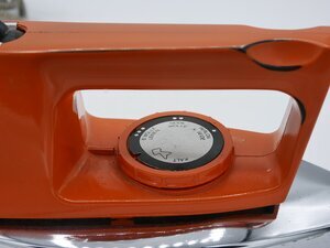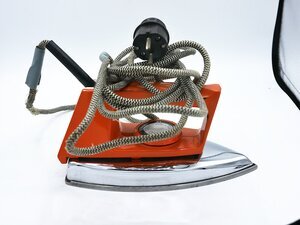Bügeleisen werden seit dem 17. Jahrhundert zum Glätten der Wäsche verwendet. Die ersten Bügeleisen bestanden aus einer Metallplatte und einem bügelartigen Holzgriff. Daher auch der Name. Mit der Elektrifizierung der Haushalte setzten sich Elektrobügeleisen mehr und mehr durch. Das orange Bügeleisen ist von der Marke Privileg. Diese war eine Eigenmarke des Versandhaus Quelle. Der eigentliche Hersteller ließ sich leider nicht ermitteln. Das Bügeleisen besitzt einen großen orangefarbenen Griff. Der darunterliegende Heizkörper besteht aus vernickeltem Eisen. In den Griff integriert ist ein Thermostat, ein Drehregler mit dem die Höchsttemperatur eingestellt werden konnte und eine rote Warnleuchte, die aufleuchtet wenn das Bügeleisen aufheizt. Fest in diesen integriert ist ein Anschlusskabel, das aus dem Griff herauskommt. Es ist mit einem mit schwarz-weißem Zackenmuster gemustertem Textilmantel isoliert und besitzt an seinem Ende einen schwarzen Schuko-Stecker. Das Bügeleisen benötigt einen Stromanschluss mit 220V und mindestens 1000 W Leistung.