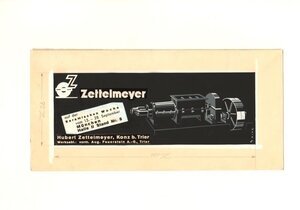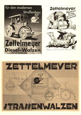DIN A4 großes Blatt mit insgesamt 4 Druckvorlagen für Werbeblätter der Firma Zettelmeyer. Auf der Vorderseite befinden sich 3 einzelne Vorlagen als Schwarz-Weiß-Zeichnungen. Die erste betrifft Diesel-Walzen der Gewichtsklassen 3 bis 18 Tonnen. Abgebildet ist eine Walze in einer perspektivischen Zeichnung. Daneben sind in einer weiteren Vorlagen Skizzen von insgesamt 3 im Arbeitseinsatz befindliche Baumaschinen zu sehen. Geworben wird mit dem Hinweis, dass es sich um Maschinen für einen rationellen Baubetrieb handelt. Mit der 3. Vorlage werden Straßenwalzen beworben. Es werden dafür 2 Straßenwalzen in Form einer skizzierten Seitenansicht gezeigt. Auf der Rückseite des DIN A4 Blattes befindet sich eine 4. Druckvorlage. Diese bezieht sich auf die in München vermutlich 1938 durchgeführte Messe "Keramische Woche". In der Schwarz-Weiß-Darstellung wird neben einer Beschreibung der Lage des Messestandes der Firma Zettelmeyer eine Keramikmaschine gezeigt. Alle 4 Druckvorlagen besitzen eine unterschiedliche Größe. Die Druckvorlagen wurden von dem in Trier ansässigen Industriegrafiker Erich Prinz erstellt.