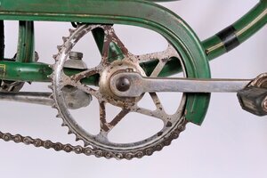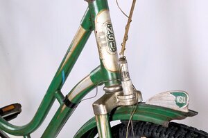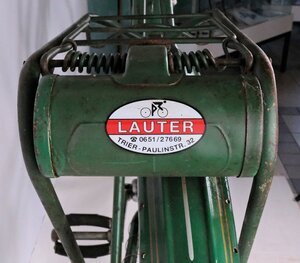 Das NSU Damenfahrrad ist grün lackiert mit feinen weißen Zierstreifen, entlang dem Rahmenrohr und der Schutzbleche, verziert. Die Rahmennummer 710260 deutet auf das Herstellungsjahr 1954 hin. Am Steuerrohr befindet sich das NSU Logo, lackiert in der Rahmenfarbe. Ebenso das Firmenemblem auf dem vorderen Schutzblech. Der verbauten Scheinwerfer und der Dynamo stammen von der Firma Lohmann. Gebremst wurde das Rad über einen Rücktritt und eine Stempelbremse, die über einen Bowdenzug vom Lenker aus bedient wurde. Dem Ledersattel sind die Firmenbuchstaben NSU eingeprägt . Etwas Neues hat sich der Hersteller, für die bisher in Leder gefertigten Werkzeugtaschen, einfallen lassen. Aus Metall hergestellt und rund in der Form, wurde der Werkzeugbehälter mit einer einfachen Klemmtechnik am Gepäckträger befestigt. (Siehe Abb.) Das Rad wurde von uns teilrestauriert, so dass es wieder fahrbereit ist. Das Rad ist heute Teil unserer neu eingerichteten Fahrradwerkstatt.