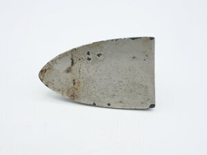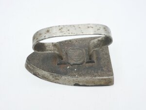 Bügeleisen werden seit dem 17. Jahrhundert zum Glätten der Wäsche verwendet. Die ersten Bügeleisen bestanden aus einer Metallplatte und einem bügelartigen Griff. Daher auch der Name. Flacheisen wurden in Privathaushalten auf der Herdsplatte, in gewerblichen Betrieben auch auf speziellen Bügeleisenöfen erhitzt und konnte dann so lange es heiß war zum Glätten der vorher mit Wasser eingesprengten Wäsche verwendet werden. Wurde das Eisen auf oder in einem Kohleofen erhitzt, musste es zuerst von Kohleresten gereinigt werden. War das Eisen zu sehr abgekühlt, musste es gegen ein gerade aufgeheiztes Exemplar ausgetauscht werden. D.h. zum kontinuierlichen Bügeln waren mehrere Bügeleisen vonnöten. War es zu sehr abgekühlt, musste es gegen ein gerade aufgeheiztes Exemplar ausgetauscht werden. D.h. zum kontinuierlichen Bügeln waren mehrere Bügeleisen vonnöten. Dieses Exemplar eines Flacheisens ist die Miniaturausgabe des einfachsten, auf einem Herd oder einem Bügeleisenofen zu erhitzenden Bügeleisens. Da es sich um ein im Prinzip gebrauchsfähiges Gerät handelt, könnte es für ganz kleine Flächen verwendet worden sein, oder es war einfach da damit Kinder Bügeln spielen konnten. Das Eisen besitzt einen angeschweißten Bandeisengriff der Rheinischen Form und unter diesem eine Gussmarke - wohl mit den nicht mehr erkennbaren Initialen des Herstellers.