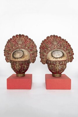 Die beiden Schädelreliquiare präsentieren die Reliquien in einer Umhüllung aus bestickter roter Seide, bekrönt von einem diademartigen Aufsatz. Eine kreisförmige Öffnung an der Vorderseite ermöglicht den Blick auf ein Stück Hirnschale. Rückseitig ist eines der Reliquiare mit der Jahreszahl 1690 bezeichnet. Herkunft und Identifizierung der Reliquien sind nicht eindeutig geklärt. Möglicherweise handelt es sich um Reliquien der hll. Stephan und Anastasius, die vor den Französischen Revolutionskriegen im Speyerer Dom verehrt wurden. Danach waren die Reliquiare zunächst verschollen, bis sie 1851 von Bischof Nikolaus von Weis (1796‒1869) in Kloster Lichtenthal bei Baden-Baden wiederentdeckt und zurück in den Dom gebracht wurden.