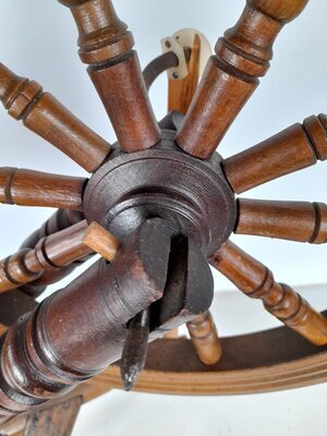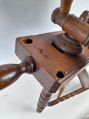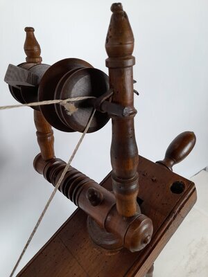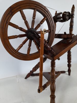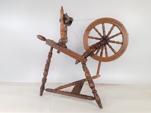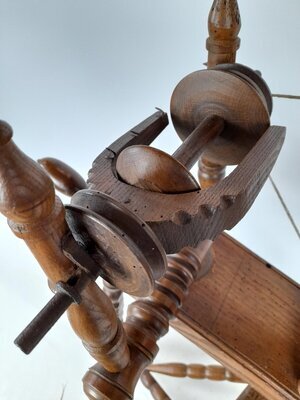 Bei diesem Spinnrad sind Antriebsrad und Spinnvorrichtung nebeneinander auf einem schräglaufenden Untergestell aufgebaut, was als Bautyp Ziege bezeichnet wird. Der Antriebsriemen verläuft hierbei mehr oder weniger horizontal. Die Fadenführung ist doppelt über Spule und Spinnwirtel am Flügel. Die Beine und die Träger der Antriebsachse sind sehr voluminös und stark eingekerbt gedrechselt. Die Speichen des Rades und die Träger des Flügels sind dagegen zierlicher, auch erscheint das Rad für das Grundgerüst zu klein. Der Flügel ist mit der Spule fest verbunden und besitzt neben der Fadenrille an der Spule noch zwei Spinnwirtel. Der Flügel hängt in dünnen Lederlaschen, die den Flügel nicht stabil halten können. Deutlich schlichter und aus hellerem Holz ist auch der Knecht, die Verbindung von Trittbrett und Antriebsachse. Vermutlich wurde er ausgewechselt. Allerdings ist auch dieses Bauteil schon wieder beschädigt. Die Verbindung zwischen Trittbrett und Knecht, meist ein Lederriemen, wurde durch ein Gurtband aus Plastik ersetzt. Die obere Auge, in das die Achse eingehängt wird, ist ausgebrochen und mit Plastikscheiben notdürftig repariert. Auf dem Tisch sind neben der noch funktionieren Spannvorrichtung zwei Löcher gebohrt, die ursprünglich wohl dazu dienten einen Rocken, eine Haspel oder ein Wassergefäß zum Flachsspinnen einzustecken. Dieses Spinnrad scheint aus mehreren alten Rädern zusammengesetzt zu sein, in Fachkreisen "Frankenstein-Spinnrad" genannt. Einige Teile weisen Benutzungspuren auf, insgesamt ist es aber durch den verbastelten Flügel nicht spinnfähig.