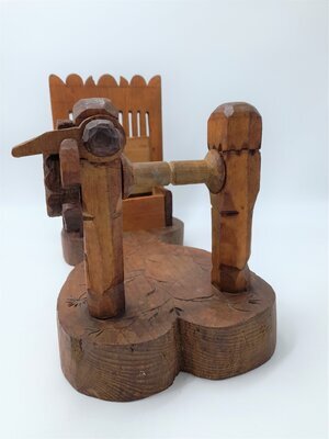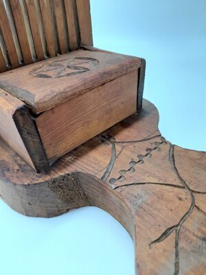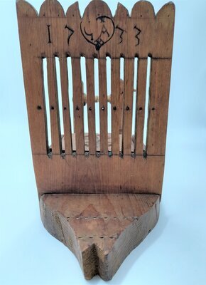 Ein Bändchenwebstuhl dient zur Herstellung von schmalen Bändern. Die Breite des Bandes ist limitiert durch die Zahl der Schlitze und Löcher im Webkamm, in diesem Fall sind es 10 Schlitze und 11 Löcher. Die Breite des fertigen Bandes kann nur durch die Dicke des gewählten Garnes beeinflusst werden. Aufgebaut ist die Webvorrichtung auf einem dicken, lyraförmigen Brett mit eingekerbten geometrischen und floralen Elementen. Im vorderen, schmalen Bereich des Webstuhls ist der Webkamm fest eingelassen. Der obere Abschluss des Kammes ist mit einem Kranz von halbkreisförmigen und dreieckigen Elementen verziert. Zwischen diesem Abschluss und den Schlitzen ist die Jahreszahl 1733 und ein leicht abgegriffenes, herzförmiges Ornament mit dem Monogramm GA eingeschnitzt. Am hinteren, breiten Ende ist der Kettbaum aufgestellt. Die Kette wird dort um die Achse aufgewickelt mittels eines hölzernen, recht grob geschnitzten Zahnrades. Dieses Zahnrad kann mit einem ebenfalls hölzernen Hakens eingerastet werden. Ein Warenbaum zum Spannen der Kette ist nicht vorgesehen, weshalb an diesem Webstuhl nur "angebunden" gewebt werden kann. Das heißt, dass der Weber den Anfang der Kette und die schon fertig gewebte Ware am eigenen Körper befestigt und dadurch die für das Weben benötige Spannung der Fäden erzeugt. Die regionale Herkunft des Webstuhls konnte nicht mehr geklärt werden, da der Sammler schon verstorben war. Aus dem Ostseeraum die Tradition ist bekannt, dass Webkämme als Verlobungsgeschenke für die Braut vom Bräutigam selbst angefertigt wurden. Das Monogramm im Herz und die etwas grobschlächtige Schnitzarbeit lassen auch hier einen ähnlichen Hintergrund vermuten. Der Webstuhl ist in einem sehr guten Erhaltungszustand und webfähig.