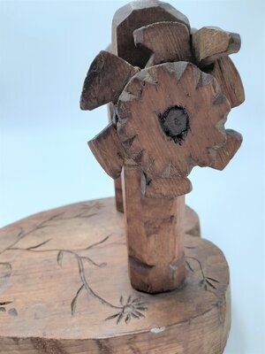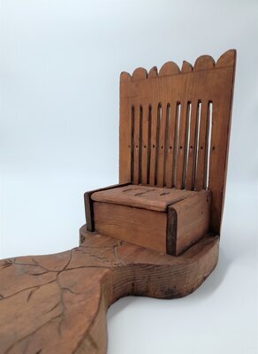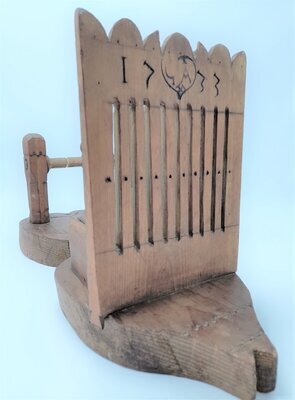 Ein Bändchenwebstuhl dient zur Herstellung von schmalen Bändern. Die Breite des Bandes ist limitiert durch die Zahl der Schlitze und Löcher im Webkamm, in diesem Fall sind es 10 Schlitze und 11 Löcher. Die Breite des fertigen Bandes kann nur durch die Dicke des gewählten Garnes beeinflusst werden. Aufgebaut ist die Webvorrichtung auf einem dicken, lyraförmigen Brett mit eingekerbten geometrischen und floralen Elementen. Im vorderen, schmalen Bereich des Webstuhls ist der Webkamm fest eingelassen. Der obere Abschluss des Kammes ist mit einem Kranz von halbkreisförmigen und dreieckigen Elementen verziert. Zwischen diesem Abschluss und den Schlitzen ist die Jahreszahl 1733 und ein leicht abgegriffenes, herzförmiges Ornament mit dem Monogramm GA eingeschnitzt. Am hinteren, breiten Ende ist der Kettbaum aufgestellt. Die Kette wird dort um die Achse aufgewickelt mittels eines hölzernen, recht grob geschnitzten Zahnrades. Dieses Zahnrad kann mit einem ebenfalls hölzernen Hakens eingerastet werden. Ein Warenbaum zum Spannen der Kette ist nicht vorgesehen, weshalb an diesem Webstuhl nur "angebunden" gewebt werden kann. Das heißt, dass der Weber den Anfang der Kette und die schon fertig gewebte Ware am eigenen Körper befestigt und dadurch die für das Weben benötige Spannung der Fäden erzeugt. Die regionale Herkunft des Webstuhls konnte nicht mehr geklärt werden, da der Sammler schon verstorben war. Aus dem Ostseeraum die Tradition ist bekannt, dass Webkämme als Verlobungsgeschenke für die Braut vom Bräutigam selbst angefertigt wurden. Das Monogramm im Herz und die etwas grobschlächtige Schnitzarbeit lassen auch hier einen ähnlichen Hintergrund vermuten. Der Webstuhl ist in einem sehr guten Erhaltungszustand und webfähig.