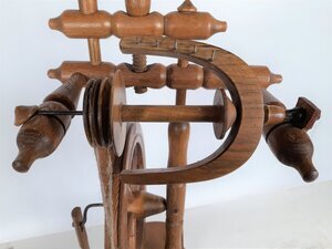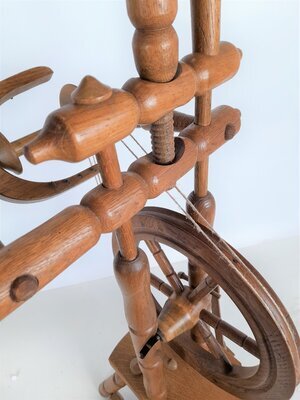 Das recht kleine Spinnrad gehört zur Bauweise der Bockspinnräder. Vertikal über einem kleinen dreibeinigen Hocker ist das Antriebsrad angebracht, oberhalb dessen wiederum die zweifädige Spinnvorrichtung sitzt. Ein sehr hoher Rocken sitzt mittig über dem Antriebsrad. Die Drechslerarbeiten sind relativ schlicht und "modern" gehalten. Der Spinnflügel ist fest verbunden, die Spule daher nicht wechselbar. Das Rad ist sehr gut erhalten, der Flügel zeigt keine Abnutzungsspuren, ebenso wenig das Trittbrett. Dies lässt den Schluss zu, dass es sich um ein reines Deko-Spinnrad handelt, mit dem nie gesponnen wurde. Der Rocken trug bei seiner Einlieferung ins Museum einen großen Bund Flachs, um die Attraktivität des Schmuckstückes zu steigern. Allerdings handelte es sich eher um grobes Werg, also Material zu Abdichten, als um fein gehechelte Spinnfasern. Die Vorbesitzerin des Spinnrades gab an, dass die Familie das Spinnrad als Geschenk zum Einzug in den neuen Bungalow 1976 erhalten habe.