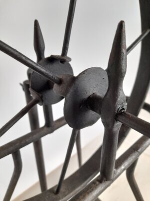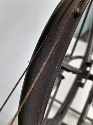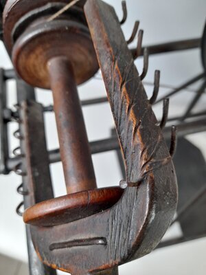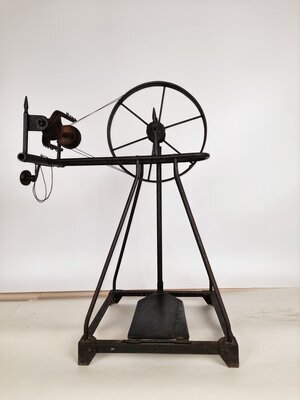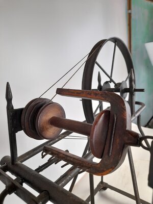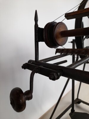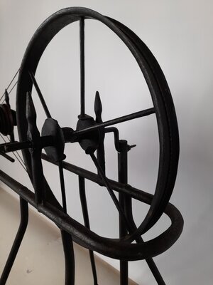 Dieses Spinnrad ist aufgrund seines Materials und seiner Bauweise sehr außergewöhnlich. Das Gestell und das Antriebsrad sind aus geschwärztem Metall gefertigt. Lediglich das Trittbrett und der Spinnflügel bestehen aus Holz. Ob es aus Mangel aus Holz oder aus Mangel an holzverarbeitenden Fähigkeiten so gebaut wurde, muss offenbleiben. Das Untergestell ist recht hoch, der Rahmen, auf dem die Radachse und die Spinnvorrichtung lagern ist nur aus einem Querstreben gebaut. Das Antriebsrad ist recht klein und ähnlich wie eine Fahrradfelge nach außen hochgezogen, um das Abrutschen des Antriebsriemens zu verhindern. Für die Stabilität des Rades sorgen nur 6 Speichen. Der Antriebsriemen ist zweifädig über Wirtel und Spule gespannt. Insgesamt ist das Spinnrad äußerst materialsparend, aber mit großem handwerklichem Geschick gebaut. Die tiefen Kerben im Holz des Flügels beweisen, dass mit diesem Spinnrad sehr viel gearbeitet wurde.