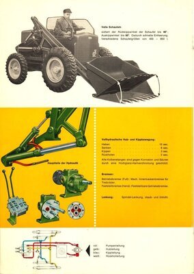 8seitige Broschüre, die den Hublader Typ L 501 beschreibt. Es handelt sich hierbei um ein Baufahrzeug mit einer im Frontbereich angebrachten Schaufel, welches für Verladearbeiten konzipiert wurde. Die Broschüre wurde mutmaßlich 1963 erstellt. Auf der Vorderseite des farbig in der Größe DIN A 4 gestalteten Heftes ist als Zeichnung ein Hublader mit beladener Schaufel abgebildet. Die Innenseiten 2 bis 6 enthalten neben detaillierten Zeichnungen und Schnittbildern verschiedener Bauteile dieser Maschine, Beschreibung der jeweiligen Konstruktion und der Leistungsmerkmale. Außerdem wird daneben das Zubehör der als temperamentvolles Universalgerät bezeichneten Maschine sowie die angebotene Sonderausrüstung beschrieben. Die Seite 7 ist im wesentlichen mit Schwarz-Weiß-Bildern und Ablichtungen gestaltet, welche die zugelassene und von einer Steuerpflicht befreite Baumaschine bei unterschiedlichen Arbeitseinsätzen zeigt. Die Broschüre wurde von dem in Trier ansässigen Industriegrafiker Erich Prinz erstellt und in der Trierer Druckerei Lintz & Co. gedruckt. Ein vergleichbares, mutmaßlich aus dem Jahre 1957 stammendes Exemplar einer solchen Werbebroschüre befindet sich ebenfalls im Besitz des Freilichtmuseums Roscheider Hof.