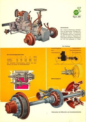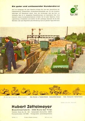 8seitige Broschüre, die den Hublader Typ L 501 beschreibt. Es handelt sich hierbei um ein Baufahrzeug mit einer im Frontbereich angebrachten Schaufel, welches für Verladearbeiten konzipiert wurde. Die Broschüre wurde mutmaßlich 1963 erstellt. Auf der Vorderseite des farbig in der Größe DIN A 4 gestalteten Heftes ist als Zeichnung ein Hublader mit beladener Schaufel abgebildet. Die Innenseiten 2 bis 6 enthalten neben detaillierten Zeichnungen und Schnittbildern verschiedener Bauteile dieser Maschine, Beschreibung der jeweiligen Konstruktion und der Leistungsmerkmale. Außerdem wird daneben das Zubehör der als temperamentvolles Universalgerät bezeichneten Maschine sowie die angebotene Sonderausrüstung beschrieben. Die Seite 7 ist im wesentlichen mit Schwarz-Weiß-Bildern und Ablichtungen gestaltet, welche die zugelassene und von einer Steuerpflicht befreite Baumaschine bei unterschiedlichen Arbeitseinsätzen zeigt. Die Broschüre wurde von dem in Trier ansässigen Industriegrafiker Erich Prinz erstellt und in der Trierer Druckerei Lintz & Co. gedruckt. Ein vergleichbares, mutmaßlich aus dem Jahre 1957 stammendes Exemplar einer solchen Werbebroschüre befindet sich ebenfalls im Besitz des Freilichtmuseums Roscheider Hof.