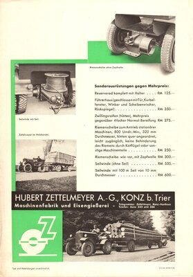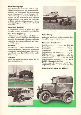4seitig, farbig gestaltete Werbebroschüre vermutlich aus dem Jahre 1936. Zusammengefaltet handelt es sich um ein Prospekt der Größe DIN A4. Beworben wird eine für den Fuhrbetrieb konzipierte Zugmaschine. Auf der Vorderseite befindet sich eine Zeichnung, die den seitlichen Teil eines Diesel-Schleppers mit einem Anhänger zeigt. Die beiden Innenseiten beinhalten einzelne Schwarz-Weiß-Zeichnungen und Fotografien des Fahrzeuges. Außerdem ist dort ein Motorblock mit Kupplungsgehäuse und Antriebsachse als perspektivische Schwarz-Weiß-Zeichnung abgebildet. Daneben befinden sich zwei Schwarz-Weiß-Bilder und zwei weiteren Zeichnungen. In der textlichen Beschreibung sind Angaben zur angebotenen Sonderausstattung und den hierfür zu entrichtenden Preise zu finden. Die Broschüre wurde von dem in Trier ansässigen Industriegrafiker Erich Prinz erstellt. Eine vergleichbare Broschüre, die ebenfalls aus dem Jahre 1936 stammen könnte, befindet sich auch im Besitz des Freilichtmuseums Roscheider Hof.