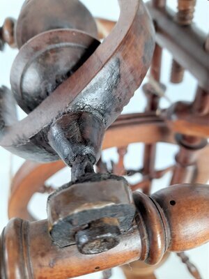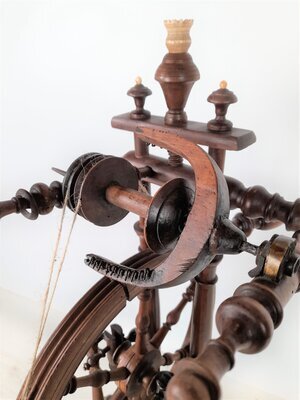 Dieses zierliche Spinnrad ist sehr aufwendig gearbeitet. Als Bockspinnrad vertikal konstruiert steht es auf drei schlanken Beinen, die genau wie der beweglich Steg, auf dem das Trittbrett ruht, mehrfach profiliert sind. Auch die beiden Träger der Radachse sind recht zierlich. Erst die beiden Träger der Spinnvorrichtung sind etwas kräftiger und überragen das Rad deutlich. Das Antriebsrad ist in der Fläche nur mit zarten Rillen verziert, die 6 Speichen weisen dagegen wieder mehr Dekor auf. Über die breite Felge läuft der doppelte Antriebsriemen zum Wirtel und zur Spule. Beide sind zwar gleich groß, doch ist die Rille der Spule tiefer eingekerbt, so dass sie schneller läuft als der Flügel. Das Schraubgewinde, mit dem die Spinnvorrichtung gespannt werden kann, ist noch gängig. Der Knauf der Gewindestange trägt eine beinerne Bekrönung. Kleine Beindrechseleien sitzen auf vielen Bauteilen als Endverzierungen und in der Form von kleinen Glöckchen an den Sicherungsstiften der Achslager. Diese Glöckchen und auch der hölzerne Ring, der auf einem der Flügelhalter noch vorhanden ist, vibrierten und klapperten wenn das Spinnrad in Betrieb war und signalisierten damit im ganzen Haus, dass fleißig gearbeitet wurde. Am vorderen Träger der Spinnvorrichtung ist ein gedrechselter Ausleger für einen Rocken angebracht, der aber leider fehlt. Die Arbeit der SpinnerInnen hat deutliche Spuren in Form von Kerben am Flügel hinterlassen.