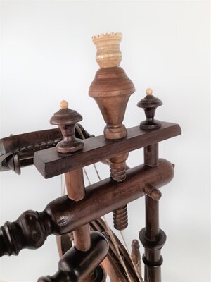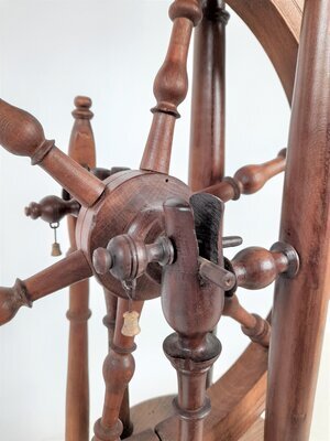 Dieses zierliche Spinnrad ist sehr aufwendig gearbeitet. Als Bockspinnrad vertikal konstruiert steht es auf drei schlanken Beinen, die genau wie der beweglich Steg, auf dem das Trittbrett ruht, mehrfach profiliert sind. Auch die beiden Träger der Radachse sind recht zierlich. Erst die beiden Träger der Spinnvorrichtung sind etwas kräftiger und überragen das Rad deutlich. Das Antriebsrad ist in der Fläche nur mit zarten Rillen verziert, die 6 Speichen weisen dagegen wieder mehr Dekor auf. Über die breite Felge läuft der doppelte Antriebsriemen zum Wirtel und zur Spule. Beide sind zwar gleich groß, doch ist die Rille der Spule tiefer eingekerbt, so dass sie schneller läuft als der Flügel. Das Schraubgewinde, mit dem die Spinnvorrichtung gespannt werden kann, ist noch gängig. Der Knauf der Gewindestange trägt eine beinerne Bekrönung. Kleine Beindrechseleien sitzen auf vielen Bauteilen als Endverzierungen und in der Form von kleinen Glöckchen an den Sicherungsstiften der Achslager. Diese Glöckchen und auch der hölzerne Ring, der auf einem der Flügelhalter noch vorhanden ist, vibrierten und klapperten wenn das Spinnrad in Betrieb war und signalisierten damit im ganzen Haus, dass fleißig gearbeitet wurde. Am vorderen Träger der Spinnvorrichtung ist ein gedrechselter Ausleger für einen Rocken angebracht, der aber leider fehlt. Die Arbeit der SpinnerInnen hat deutliche Spuren in Form von Kerben am Flügel hinterlassen.