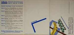 Faltbare Broschüre der Firma Zettelmeyer anlässlich der 1937 in München durchgeführten Reichsnährstands-Schau. Diese Messe fand auf der Theresienwiese in München statt. Die farbig gestaltete Broschüre wurde von dem in Trier ansässigen Industriegrafiker Erich Prinz erstellt und in der Druckerei Dackweiler & Co. (vorm. Schaar & Dathe) in Trier gedruckt. Im gefalteten Zustand handelt es sich um eine Broschüre, die annähernd die Größe DIN A 5 besitzt. Auf der zentralen Seite befinden sich neben dem Firmenname und dem Logo je eine Skizzen des Diesel-Schleppers Typ Z II mit Zwillingsbereifung und mit einem Führerhaus. In der Broschüre wird die Lage des Messestandes der Firma Zettelmeyer grafisch beschrieben. Außerdem enthält sie durch verschiedene Zeichnungen und Beschreibungen Erläuterungen zu den angebotenen Modellen des Diesel-Schleppers, dem zugedachten Verwendungszweck sowie der möglichen Sonderausstattung.