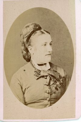 Das Foto im ovalem Passepartoutrahmen zeigt eine Dame mittleren Alters, die etwas seitlich sitzt und zur linken Seite schaut. Man sieht nur die Oberbekleidung, vermutlich das Oberteil eines Kleides oder Kostüm. Dieses ist komplett bis zum Hals zugeknöpft. Aus dem Ausschnitt ragt ein kleiner weißer Spitzenkragen. Außerdem erkennt man ein enganliegendes Samtband mit Anhänger um den Hals. Den Halskragen ziert eine große, mit Quasten versehene Schleife aus Seide. Die Haare sind streng in der Mitte gescheitelt und nach hinten kunstvoll gesteckt zu einer bis zum Oberkopf gehenden Flechtfrisur arrangiert. Die Frisur wird von einem Haarnetz und einem Samtband gehalten. Auf der Rückseite, die rosafarben eingefärbt ist, sieht man das Emblem mit verschiedenen Auszeichnungen des Ateliers J.F. Klinger aus Braunau/Inn.
