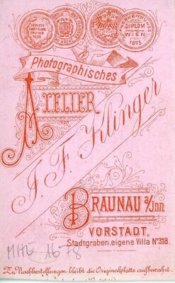 Das Foto im ovalen Passepartoutrahmen zeigt eine junge Frau, die freundlich in die Kamera schaut. Sie trägt ein dunkles Kleid, das von der Taillenmitte bis zum Halsausschnitt enganliegend und durchgeknöpft ist. Aus dem Ausschnitt ragt ein weißer kleiner Kragen (eine Art Schluppenkragen) an dem eine schwarze Samtschleife befestigt ist. Als Schmuck trägt sie kleine Ohranhänger sowie ein Samt-Halsband , ebenfalls mit Anhänger. Ihre Haare sind komplett aus dem Gesicht gekämmt und am Hinter- und bis zum Oberkopf hin kunstvoll zu einer Flechtfrisur arrangiert. Dir Rückseite des Fotos ist rosafarben eingefärbt und man erkennt das Firmenlogo mit verschiedenen Auszeichnungen des Ateliers J.F. Klinger aus Braunau/Inn.