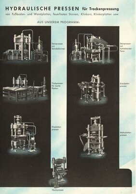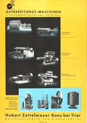 Vierseitiges Faltblatt der Größe DIN A4. Es beinhaltet verschiedene Keramikmaschinen zur Verarbeitung und Pressung von Baumaterial. Die Broschüre wurde von dem in Trier ansässigen Industriegrafiker Erich Prinz erstellt und in der Trierer Druckerei J. Lintz gedruckt. Neben den gezeichneten Druckvorlagen befindet sich ein nahezu identisches weiteres Exemplar dieser Broschüre im Besitz des Freilichtmuseums Roscheider Hof. Das Vergleichsexemplar wurde in der Trierer Druckerei Dackweiler und Co. hergestellt. Das mehrfarbige Prospekt zeigt auf der Vorderseite als perspektivische Schnittzeichnung ein Mahlwerk (Kollergang) und eine Zweiplattenpresse. Seite zwei enthält sechs Zeichnungen unterschiedlicher Maschinen zur Naß- und Trockenmahlung. Die Seite drei beinhaltet neun unterschiedliche hydraulische Pressen zur Trockenpressung von Fußboden- und Wandplatten, feuerfesten Steinen, Klinkern, Klinkerplatten, usw.. Die Rückseite des Werbeprospektes zeigt unterschiedliche Maschinen zur Aufbereitung des Baumaterials und weist mit vier Abbildungen auf weitere hydraulische Hilfsmaschinen und Membranpumpen der Firma Zettelmeyer hin.