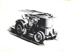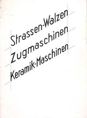 Zweiseitig gestaltete Druckvorlage, die annäherend die Größe DIN A4 erreicht. Auf der Vorderseite sind in einer schrägen bzw. perspektivischen Schreibweise als Textblock die Bezeichnungen "Strassen-Walzen", "Zugmaschine" und Keramik-Maschinen" abgebildet. Es handelt sich wohl um Vorlagen zur Gestaltung von Werbebroschüren. Auf der Rückseite befindet sich die perspektivische Schwarz-Weiß-Zeichnung eines Traktors. Die Druckvorlagen wurden von dem in Trier ansässigen Industriegrafiker Erich Prinz erstellt.