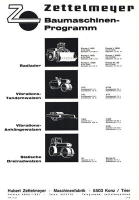 Vierseitige farbig gestaltete Broschüre für den Radlader Europ KL 30. Im gefalteten Zustand handelt es sich um eine Broschüre der Größer DIN A4. Das dargestellte Modell wurde von Ende der 1960er bis Mitte der 1970er Jahre produziert. Es war der erste sogenannte Knicklader der Firma Zettelmeyer. Die Vorderseite zeigt die farbige Fotografie des Radladers während der Arbeit in einem Steinbruch. Auf den Innenseiten der Broschüre werden detailiert der Aufbau, die Funktionsweise, die technischen Leistungsmerkmale, die Einsatzmöglichkeiten und die Maße dieser Baumaschine beschrieben. Passend dazu befindet sich dort eine farbige Zeichnung, die den Radlader seitlich zeigt. Außerdem werden mittels zweier Schwarz-Weiß-Skizzen die äußeren Maße sowie die Bewegungsmaße der Baumaschine und der Schaufel veranschaulicht. Die Rückseite beinhaltet mehrere Schwarz-Weiß-Zeichnungen und Angaben zur gesammten Produktpalette der Firma Zettelmeyer. Die Broschüre wurde von dem in Trier ansässigen Industriegrafiker Erich Prinz erstellt.