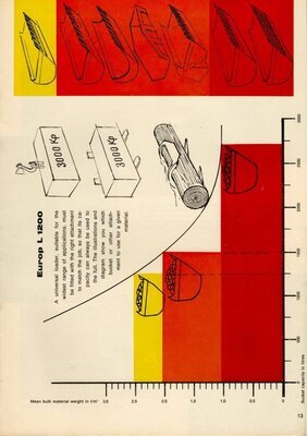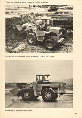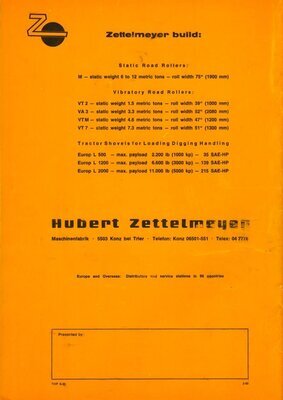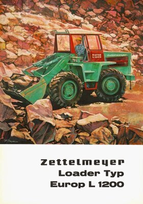 Englischsprachige Werbebroschüre. Die 16seitige, farbrig gestaltete Broschüre besitzt im gefalteten Zustand die Größe DIN A4. Das dargestellte Modell wurde in den 1960er Jahren produziert. Auf der Vorderseite ist die Baumaschine während der Arbeit in einem Steinbruch zeichnerisch abgebildet. Auf den Innenseiten der Broschüre werden detailiert der Aufbau, die Funktionsweise, die technischen Leistungsmerkmale, die Einsatzmöglichkeiten und die Maße beschrieben. Jeweils passend zu den Angaben finden sich in dem Prospekt auch Zeichnungen der gesamten Baumaschine, Zeichnungen mit Ausschnitten und Schnittzeichnungen einzelner Bauteile. Auf der Seite 15 befinden sich 2 Schwarz-Weiß-Fotografien. Diese zeigen das etwas kleine Radladermodell Europ L 500 und das größere Fahrzeug mit der Bezeichnung Europ L 2000. Die Rückseite beinhaltet Angaben zur übrigen Produktpalette der Firma Zettelmeyer. Die Broschüre wurde von dem in Trier ansässigen Industriegrafiker Erich Prinz erstellt.