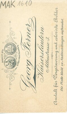 Die Vignettenaufnahme zeigt eine junge Frau mit einem dunklen Oberteil, welches im Brustbereich üppig in Falten gelegt ist. An den Puffärmeln erkennt man Spitzeneinsätze. An dem hohen Stehkragen trägt sie eine runde Brosche. Ihre Haare sind in der Mitte gescheitelt, streng nach hinten gekämmt und am Hinterkopf zusammen gesteckt. Der Blick geht links an der Kamera vorbei. Das Foto entstand im Atelier Georg Ferner in Kaiserslautern, Alleestrasse 3. Auf der Rückseite befindet sich Eigenwerbung sowie der Hinweis auf Prämierungen.