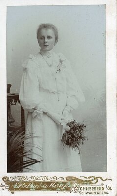 Auf dem Foto erkennt man eine junge Frau, die angelehnt an einer Holzdekoration in einem Fotostudio steht und einen Blumenstrauß in beiden Händen hält. Sie trägt ein weißes Kleid, dessen Rock glatt fällt. Das Oberteil Oberteil hingegen ist reich mit Rüschen, Spitzen und einem kleinen Blumenbouquet besetzt, die Ballonärmel an Manschetten und Schultern zusätzlich mit Schleifen. Am Stehkragen erkennt man eine kleine Brosche. Zudem trägt sie eine Halskette und kleine Ohrhänger. Ihre leicht gewellten Haare sind nach hinten gekämmt. Unter dem Foto steht das Emblem des Ateliers Maass. Auf der Rückseite ist ebenfalls die Eigenwerbung des Ateliers Maass aus Schneeberg und Schwarzenberg, mit dem Hinweis auf Nachbestellungen, zu sehen.