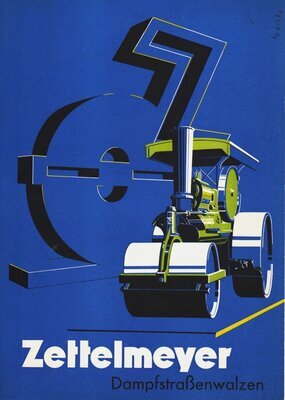 4seitige Broschüre. Im gefalteten Zustand handelt es sich um eine Broschüre der Größer DIN A4. Es handelt sich um Straßenwalzen, die mittels einer 2 Zylinder-Verbund-Dampfmaschine angetrieben werden. Die Firma Zettelmeyer hat entsprechende Baumaschinen seit 1910 produziert. Die Dampfmaschine konnte mit Steinkohle, Koks, Holz und Kohlen von geringem Heizwert betrieben werden. In der vorliegender Broschüre werden 5 unterschiedliche Typenklassen mit einem Leergewicht zwischen 8,5 Tonnen bis 18 Tonnen beworben. Auf der Vorderseite befindet sich neben dem Firmenname und dem Firmenlogo die perspektivische Skizze einer Straßenwalze. Die beiden Innenseiten beinhalten Schnittzeichnungen der Dampfmaschine und der Kurbelwelle sowie die Schwarz-Weiß-Zeichnung einer Dampfstraßenwalze in einer Seitenansicht. Neben den Abbildungen werden die einzelnen Bauteile und die jeweilige Funktionsweise beschrieben. Auf der Rückseite ist der Aufbau bzw. der Antrieb der Walzräder beschrieben und durch eine Schwarz-Weiß-Zeichnung illustriert. Im unteren Bereich dieser Seite befindet sich eine tabellarische Beschreibung der verschiedenen Modelle (Typen B 8,5, B 10, C, D und E) sowie der jeweiligen Leistungsmerkmale und der Maße. Außerdem sind dort Angaben zum Zubehör und zur möglichen Sonderausrüstung zu finden. Die Broschüre wurde von dem in Trier ansässigen Industriegrafiker Erich Prinz erstellt.
