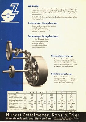 4seitige Broschüre. Im gefalteten Zustand handelt es sich um eine Broschüre der Größer DIN A4. Es handelt sich um Straßenwalzen, die mittels einer 2 Zylinder-Verbund-Dampfmaschine angetrieben werden. Die Firma Zettelmeyer hat entsprechende Baumaschinen seit 1910 produziert. Die Dampfmaschine konnte mit Steinkohle, Koks, Holz und Kohlen von geringem Heizwert betrieben werden. In der vorliegender Broschüre werden 5 unterschiedliche Typenklassen mit einem Leergewicht zwischen 8,5 Tonnen bis 18 Tonnen beworben. Auf der Vorderseite befindet sich neben dem Firmenname und dem Firmenlogo die perspektivische Skizze einer Straßenwalze. Die beiden Innenseiten beinhalten Schnittzeichnungen der Dampfmaschine und der Kurbelwelle sowie die Schwarz-Weiß-Zeichnung einer Dampfstraßenwalze in einer Seitenansicht. Neben den Abbildungen werden die einzelnen Bauteile und die jeweilige Funktionsweise beschrieben. Auf der Rückseite ist der Aufbau bzw. der Antrieb der Walzräder beschrieben und durch eine Schwarz-Weiß-Zeichnung illustriert. Im unteren Bereich dieser Seite befindet sich eine tabellarische Beschreibung der verschiedenen Modelle (Typen B 8,5, B 10, C, D und E) sowie der jeweiligen Leistungsmerkmale und der Maße. Außerdem sind dort Angaben zum Zubehör und zur möglichen Sonderausrüstung zu finden. Die Broschüre wurde von dem in Trier ansässigen Industriegrafiker Erich Prinz erstellt.