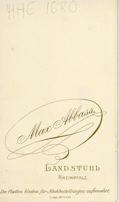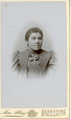 Das Foto ist eine Vignettenaufnahme einer Frau, die bis zur Taille zu sehen ist. Ihre dunklen, leicht gewellten Haare sind nach hinten gekämmt und vermutlich im Nacken zusammen gebunden. Das Oberteil hat angedeutete weite und unifarbene Puffärmel, ist sonst enganliegend, quer kariert und mit Taillengürtel und kleinem Schluppenkragen versehen. Darüber sieht man eine Art Jackenteil, Bolero o.ä., mit großem Revers, das vorne offen steht. Unter der Aufnahme steht Name und Ort des Fotografen. Auf der Rückseite ist ebenfalls das Logo des Fotografen Max Abbass aus Landstuhl mit Hinweis zu Nachbestellungen zu sehen.