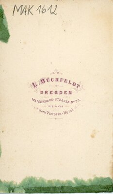 Die Aufnahme zeigt eine junge Frau die in einem Fotostudio hinter einem Gebetsstuhl mit gedrechselter Rückenlehne steht. Der Stuhl hat einen gepolsterten Sitz sowie eine gepolsterte Armlehne mit langen Fransen.Die junge Frau trägt ein einfaches, bodenlanges dunkles Kleid mit langen Armen und einem kleinen weißen Bubikragen. Um die Taille trägt sie einen breiten Gürtel mit einer großen Schnalle. In den Händen hält sie ein Buch, welches auf der Armlehne aufliegt. Ihre glatten Haare sind in der Mitte gescheitelt, streng nach hinten gekämmt und am Hinterkopf zusammen gesteckt. Leicht nach links gedreht schaut sie an der Kamera vorbei. Das Foto entstand im Studio L. Büschfeldt in Dresden, Waisenhaus-Strasse, Nr. 30. Auf der Rückseite befindet sich das Emblem des Fotostudios.