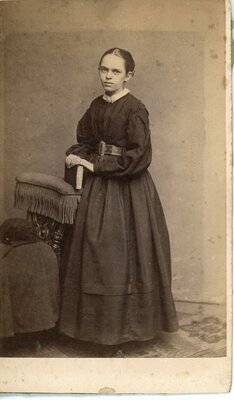Die Aufnahme zeigt eine junge Frau die in einem Fotostudio hinter einem Gebetsstuhl mit gedrechselter Rückenlehne steht. Der Stuhl hat einen gepolsterten Sitz sowie eine gepolsterte Armlehne mit langen Fransen.Die junge Frau trägt ein einfaches, bodenlanges dunkles Kleid mit langen Armen und einem kleinen weißen Bubikragen. Um die Taille trägt sie einen breiten Gürtel mit einer großen Schnalle. In den Händen hält sie ein Buch, welches auf der Armlehne aufliegt. Ihre glatten Haare sind in der Mitte gescheitelt, streng nach hinten gekämmt und am Hinterkopf zusammen gesteckt. Leicht nach links gedreht schaut sie an der Kamera vorbei. Das Foto entstand im Studio L. Büschfeldt in Dresden, Waisenhaus-Strasse, Nr. 30. Auf der Rückseite befindet sich das Emblem des Fotostudios.