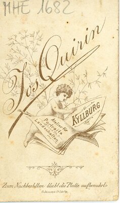Die Aufnahme im Vignettenstil zeigt eine junge Frau, die an einem reichlich verzierten Holzstuhl steht, wobei die rechte Hand auf der Kopflehne abgelegt ist. In der linken Hand hält sie ein kleines Blumenbouquet. Sie blickt freundlich direkt in die Kamera. Sie trägt ein dunkles glatt fallendes Kleid mit Keulenärmeln. Das Oberteil ist enganliegend, mit einem Taillengürtel. Der große Herzausschnitt-Brusteinsatz aus hellem Stoff ist reichlich mit Applikationen in Ranken- und Blumenform verziert und endet an den Schultern und am Hals mit einem kleinen Spitzen-Stehkragen. Die junge Frau hat ihre Haare glatt nach hinten gebunden. Sie trägt kleine Ohrhänger. Unter der Fotografie ist der Name Quirin und der Ort Kyllburg schwach zu erkennen. Auf der Rückseite sieht man das komplette Logo mit Hinweis auf Nachbestellungen des Fotografen Jos. Quirin aus Kyllburg.