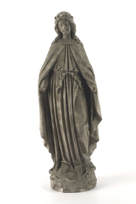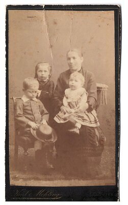 Die Aufnahme zeigt eine Dame mittleren Alters, die in einem Fotostudio vor einer verzierten Studioattrappe steht. Sie trägt ein dunkles Krinolinenkleid mit Pagodenärmeln. Darunter ist eine helle langärmlige Bluse mit Ballonärmeln und einem kleinen Spitzenkragen zu erkennen. Als Schmuck trägt sie eine große runde Brosche am Kragen, eine lange dünne Kette mit einem großen Kreuzanhänger, einen Ring an der linken Hand und Ohrringe. Ihr rechter Arm liegt locker auf der Attrappe auf. Ihre wsl. langen Haare sind als Zopffrisur zusammengesteckt. Ihr Blick geht gerade in die Kamera. Das Foto entstand beim Photographen W. Ernst in Hannover