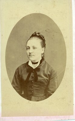 .Das Foto, das vor einer Art Fototapete aufgenommen wurde, zeigt eine sehr junge Frau, die an einem Zaun oder Geländer (als Attrappe) steht und links an der Kamera vorbeischaut. Sie trägt ein schwarzes Ausgeh- oder Trauerkleid, vermutlich zweiteilig, dass durch einen Taillengürtel unterteilt ist. Der Rock fällt glatt herunter. Das Oberteil ist üppig mit Längsvolants und Stickereien verziert. Es hat Ballonärmel die unterhalb des Ellenbogens eng zum Handgelenk schließen. Am Hals erkennt man ein kleines Stehbündchen dass in einen längeren Schluppenkragen übergeht. Die Haare der jungen Frau sind hoch bis zum Oberkopf toupiert, darauf ist ein großer runder Hut festgesteckt (eventuell ein Bergere-Hut) . Als Schmuck erkennt man eine lange schwarze Kette, kleine Ohrhänger und am linken Ringfinger einen Ring. In der rechten Hand hält sie ein kleines Blumenbouquet. Unter der Fotografie steht der Name des Ateliers Germania aus St. Johann. Die Rückseite ist nicht beschriftet.