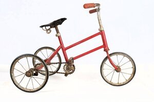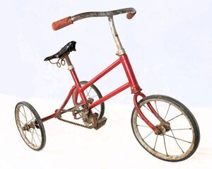 Das Dreirad wurde in den 1920/1930er Jahren für Kinder konstruiert. Ursprünglich hatte das Dreirad eine schwarze Farbe, wurde aber im Laufe der Jahre mindestens einmal mit roter Farbe neu lackiert. Vermutlich sind damit auch Abziehbilder verschwunden, die auf den Hersteller schließen lassen. Einzig der Ledersattel, in den ein Löwe eingeprägt ist, könnte eventuell einen Hinweis geben, der uns aber leider verschlossen bleibt. Die drei Speichen Räder haben einen Durchmesser von 25 cm und mit einer Vollgummibereifung ausgestattet. Der Anrieb erfolgt mittels Pedalen und Fahrradkette auf den hinteren Zahnkranz, der auf die Hinterachse aufgeschweißt ist. Durch diese starre Verbindung drehen sich die Pedalen zwangsläufig immer mit. Gebremst werden konnte nur mit den Füßen, da weder Vorder- noch Hinterräder eine Bremsvorrichtung hatten.