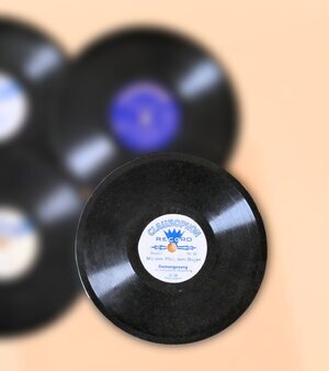 Ein Konvolut von alten Schellackplatten mit Kinderliedern. Die Platten haben einen Durchmesser von 15 cm passend auch zu den Kindergrammophonen Bingola I und II aus unserer Sammlung. Hergestellt wurden unsere Tonträger von der Firma Clausophon (blaues Etikett) mit den Liedern „Weißt Du wieviel Sternlein stehen oder Lustig ist das Zigeunerleben“. Unter der Marke Nimbus, die ebenfalls zu Clausophon gehörte, sind Titel mit „Fuchs du hast die Ganz gestohlen oder Kommt ein Vogel geflogen“ vorhanden. Die Marke Homocord mit dem Lied „Zeig her eure Füßchen“ in unserem Bestand, gibt es in dieser Schreibweise erst seit 1928.