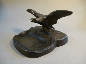 Aschenbecher aus Bronze mit schreiendem Adler und weit gespreizten Flügeln. Hergestellt wurde er nach dem Deutsch-Französischen Krieg 1870/1871 und sollte die Stärke des Deutschen Königreich und später des Deutschen Kaiserreichs symbolisieren. Der Aschenbecher wurde in Massenproduktion bis 1918 hergestellt und war beliebtes Erinnerungsstück an die Militärzeit. Das Unterteil, der Aschenbehälter und Sockel für den Adler wurden gepresst, der Adler gegossen und beide Teile zusammengelötet. Rechts neben dem Adler auf dem Sockel sind Fußspuren eines Vogels dargestellt. Der Aschenbecher ist anschließend schwarz patiniert worden.