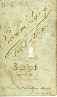 Das Bild zeigt eine junge Frau die angelehnt an einer Art Holzattrappe, vor einer Fototapete o. ähnlichem, steht. Sie trägt ein 2-teiliges dunkles Kleid. Das Oberteil ist komplett enganliegend, mit langer Knopfleiste und kleinem Schößchen bis über die Hüfte. Aus dem kleinen Halskragen und den Manschetten ragt weißer Stoff. Sie trägt außerdem eine mittellange Kette mit Kreuz und Ohrhänger. In den Händen hält sie ein Buch. Sie schaut geradewegs und freundlich in die Kamera. Ihre Haare sind streng in der Mitte gescheitelt und nach hinten gebunden. Unter der Fotografie ist das Emblem des Fotografen Bernhard Schery aus Sulzbach. Auf der Rückseite ist ebenfalls das Logo mit Hinweis auf Nachbestellungen vermerkt.