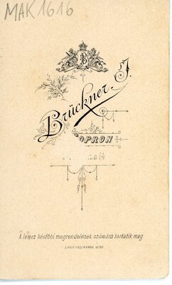 Das Foto entstand als Vignettenaufnahme in einem Fotostudio vor einem hellen Hintergrund. Das Mädchen lehnt an einer Art Zaun aus Birkenstämmen. Es trägt ein langärmliges, hell gemustertes Kleid mit mehreren Spitzeneinsätzen und einen hellen Gürtel um die Taille. Das Kleid hat einen großen, mit Spitze unterlegten, Reverskragen unter dem man eine helle Bluse mit Stehkragen und dünnen quer verlaufenden Biesen erkennen kann. Am rechten Handgelenk ist ein Armband mit einem Herzanhänger zu sehen. Die Haare sind nach hinten gekämmt und als Zopffrisur am Oberkopf zusammengesteckt. Leicht nach rechts gedreht schaut sie an der Kamera vorbei. Das Foto entstand im Fotostudio J. Brückner in Sopron (Ungarn) Auf der Rückseite befindet sich das Emblem des Fotostudios.