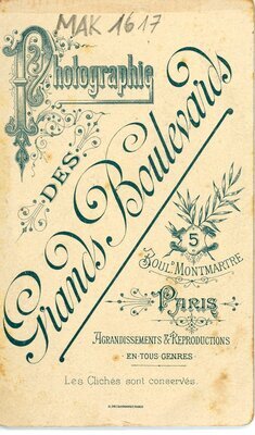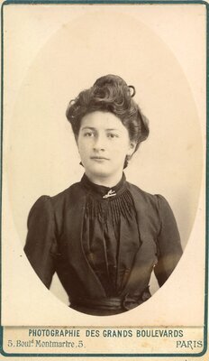 Das Foto in einem ovalen Passepartoutrahmen zeigt eine junge Dame in einem dunklen Oberteil mit leicht angedeuteten Puffärmeln. Im vorderen Bereich erkennt man eine Art Bluseneinsatz mit kurzen Längsbiesen und einem kleinen Stehkragen. Um die Taille ist ein dunkles Band mit einer Schleife zu erkennen. Als Schmuck trägt die Dame eine Brosche am Stehkragen sowie Ohrhänger. Ihre Haare sind als Gibson Girl Frisur arrangiert. Leicht nach rechts gedreht schaut sie freundlich an der Kamera vorbei. Die Aufnahme entstand im Atelier Photographie des Grand Boulevards, 5, Boul.des Montmartre in Paris. Auf der Rückseite befindet sich Eigenwerbung des Ateliers und der Hinweis auf Nachbestellungen und Vergrößerungen.