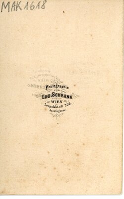 Die Aufnahme zeigt eine junge Dame die in einem Fotostudio auf einem gemusterten Teppich an einem verzierten Stuhl aus hellem Holz steht. Rechts, im Hintergrund, ist als Dekoration ein gemusterter Vorhang zu sehen der von einer Kordel mit Posamenten zusammengehalten wird. Die Dame trägt ein längs gestreiftes Krinolinenkleid mit Pagodenärmeln. Der Schulter- und Brustbereich sowie die Armabschlüsse sind mit einem dunklen in Falten gelegten Band verziert. Am Halsausschnitt erkennt man den kleinen hellen Bubikragen und an den Armen die Patten einer Bluse. Die rechte Hand liegt locker auf der Rückenlehne des Stuhls auf. Eine Brosche und eine lange dünne Kette, wsl. mit einer Damentaschenuhr trägt sie als Schmuck. Die schulterlangen dunklen Haare sind in der Mitte gescheitelt. Die Aufnahme entstand im Studio Lud. Schrank in Wien, Leopoldstadt 256, Josefsgasse. Auf der Rückseite befindet sich das Emblem des Studios.