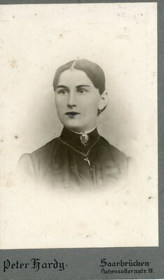 Das Bild im Vignettenstil zeigt eine elegante junge Dame, die rechts an der Kamera vorbeischaut. Ihre dunklen Haare sind in der Mitte gescheitelt und nach hinten, wahrscheinlich zu einem Knoten, zusammengebunden. Man erkennt nur ein dunkles, in Längsfalten gelegtes dunkles Oberteil bis zum Brustansatz. Aus dem kleinen Stehkragen ragt eine weiße Spitze. Am Kragen selbst ist eine Brosche befestigt. Außerdem trägt die junge Frau eine Halskette mit Anhänger. Die Ärmel sind nicht zu erkennen. Unter der Fotografie steht Name und Adresse des Fotografen Peter Hardy, Hohenzollernstr. 19 in Saarbrücken. Auf der Rückseite sieht man eine Art Firmenstempel, ebenfalls mit Name, Adresse und Hinweis auf Nachbestellungen und Vergrößerungen.