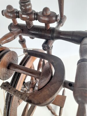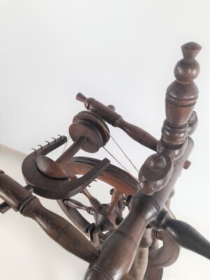 Dieses kleine, mit nur wenigen Drechseleien versehen Spinnrad ist niemals benutzt worden. Weder das Trittbrett noch der Flügel zeigen Abnutzungspuren. Konsturiert ist es in der Art der Bockspinnräder mit einem zweifädigen Antrieb, bei dem der Riemen über die Spule und den Spinnwirtel läuft. Der hohe Rocken trug sicherlich einen großen Busch Flachs. Das Faserloch am Flügel ist nicht wie üblich aus Metall geformt, sondern aus Holz, also eher ungeeignet, um die Fasern glatt durchlaufen zu lassen. Der Dorn des Flügels ist aus viel zu dünnem Metall und daher schon verbogen. Theoretisch ist es spinnfähig, es würde aber viel Mühe kosten, mit diesem Spinnrad zu arbeiten. Es ist davon auszugehen, dass es allein als Dekorationsstück angefertigt wurde.