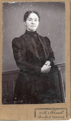Das Bild zeigt eine junge Frau, die mit überkreuzten Händen an einen Stuhl angelehnt steht und direkt in die Kamera schaut. Sie trägt vermutlich eine Art "Ausgehkostüm", Promenadenkleid oder auch ein Trauerkostüm. Das Oberteil ist gefertigt im Stil eines Boleros, vorne offen und mit kleinen Volants umrandet. Unter dem Bolero erkennt man einen plissierten Brustbereich und einen hohen Stehkragen, der mit einer Brosche verziert ist. Die leichten Puffärmel laufen ab dem Ellenbogen gerade. Der Rock fällt glatt. Außer der Brosche trägt die Dame noch kleine Ohrringe. Ihre Haare sind mittelgescheitelt und am Hinterkopf zusammengebunden oder -gesteckt. Im Hintergrund erkennt man eine Art Wandpaneele. Unter der Fotografie steht Name und Adresse des Fotografen A. Traub, Zehnstr. 7, Durlach. Die Rückseite ist nicht beschriftet.
