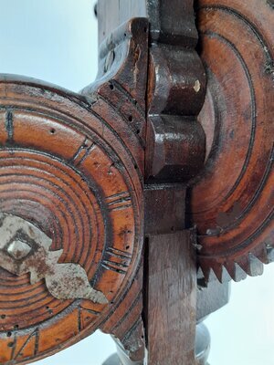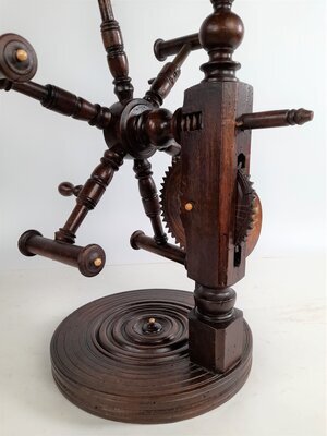 Diese kleine Drehhaspel ist äußerst dekorativ aus dunklem Holz gestaltet. Aufwendige Drechselarbeiten und Einlegearbeiten aus Bein machen sie zu einem Luxusobjekt. Das Zählwerk ist zudem mit geschnitzten Zifferblatt und metallenem Zeiger ausgestattet, der die Anzahl der Umdrehungen zählt und einer hölzernen Zunge, die von einem Stift auf dem Zahnrad gebogen wird, bis sie zurückschnellt, sobald eine bestimmte Anzahl an Drehungen erreicht ist. Zahlreiche Holzwurmlöcher weisen auf einen früheren Befall hin, der aber nicht mehr aktiv ist.