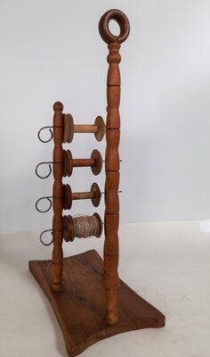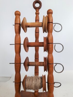 Der Spulenhalter besteht aus einem flachen, an allen Seiten leicht konkav eingeschwungenem Brett und drei auf ihm befestigten gedrechselten Stäben. Zwei der Stäbe haben Durchbohrungen, durch die man dünne Mettallstifte stecken kann, deren Ende zu einem kreisförmigen Griff gebogen sind. Auf diese Stifte lassen sich vier Spinnradspulen stecken. Der hintere Stab ist deutlich höher und endet in einem kreisförmigen, gedreckselten Ring aus Holz. Hierbei könnte es sich um einen Tragegriff handeln oder aber auch um eine große Öse, durch die die vier Fäden von den Spulen kommend auf dem Weg zum Spinnrad gefädelt wurden, bevor Sie dort in einem letzten Arbeitsschritt gezwirnt wurden. Die vier Spulen auf dem Halter sind alle unterschiedlich, wurden wohl aus Überresten verschiedener Provenienzen hier zusammengeführt.