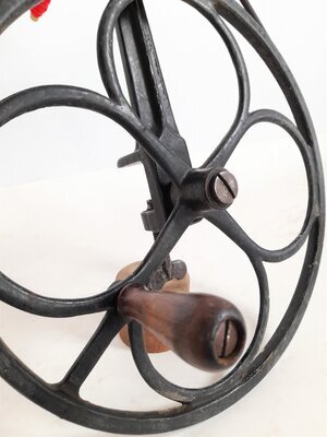 Dieses aus Gusseisen hergestellte Spulrad besteht aus einer Schraubklemme, mit der es an einer Tischkante festgemacht werden konnte, und einem Antriebsrad mit einem Vierpass, dessen Achse genau an der Halterung sitzt. Angetrieben wird das Rad von einem auf einem Steg aufliegenden Handgriff mit Holzummantelung. Aus der Schraubklemme ragt ein hoher Mast heraus, auf dem die Halterung der Spindel sitzt. Ein in der Nut des großen Rades liegender Lederriemen treibt die Spindel an. Auf den metallenen Dorn der Spindel wird eine Papphülse gestülpt, hierauf der Faden aufgewickelt und die dann in das Weberschiffchen eingelegt wird.
