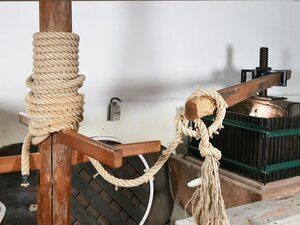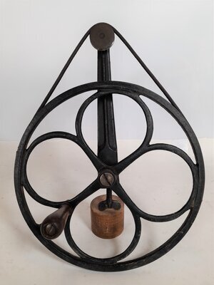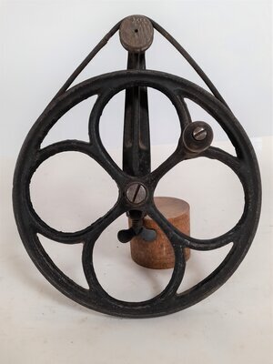Dieses etwas kleinere ebenfalls aus Gusseisen hergestellte Spulrad besteht aus einer Schraubklemme, mit der es an einer Tischkante festgemacht werden konnte, und einem Antriebsrad mit einem Vierpass, dessen Achse genau an der Halterung sitzt. Angetrieben wird das Rad von einem auf einem Steg aufliegenen Handgriff mit Holzummantelung. Aus der Schraubklemme ragt ein hoher Mast heraus, auf dem die Halterung der Spindel sitzt. Ein in der Nut des großen Rades liegender Lederriemen treibt die Spindel an. Auf den metallenen Dorn der Spindel wird eine Papphülse gestülpt, hierauf der Faden aufgewickelt und die dann in das Weberschiffchen eingelegt wird. Aus der alten Inventarnummer "zu 359-83" geht hervor, dass es 1983 in das Museum kam und in einem Zubehörkonvolut zu einer Strickmaschine eingeliefert wurde. alte Inventarnummer